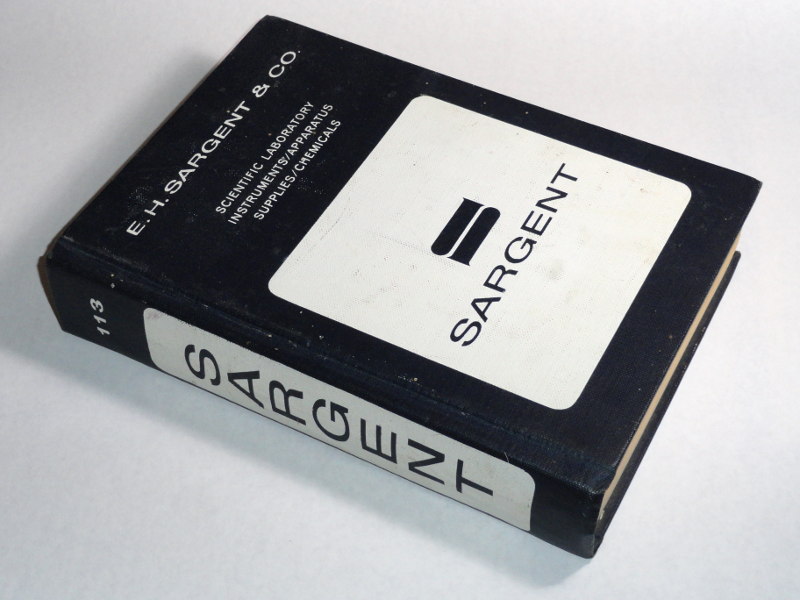 | 14955 | Sargent, E. H. | E. H. Sargent & Co. Catalog 113 | E. H. Sargent & Co. | Good. Covers and spine have some soiling. | 7.5 by 11 inches, nearly seven pounds, a catalog of scientific laboratory instruments/apparatus supplies/chemicals with many photos and an index. | Trade catalog, E. H. Sargent & Co. | $60 |