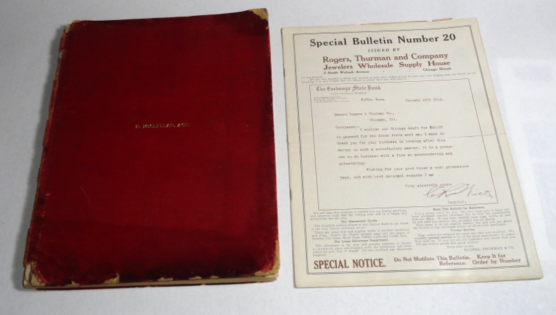 | 15667 | Rogers, Thurman & Co. | Rogers, Thurman & Co. Jewelry Catalog Circa 1914 | Rogers, Thurman & Co. | Fair. Spine is chipped, corners of covers are worn, some short tears inside. | 9 x 12 inches, faux leather, catalog for jewelry, silverware, watchs, clocks and more. There are many line drawing illustrations. Also included, with torn pages, is a 17 page Special Bulletin Number 20 soliciting new business. | Trade catalog, Rogers, Thurman and Company, Chicago, Illinois | $50 |