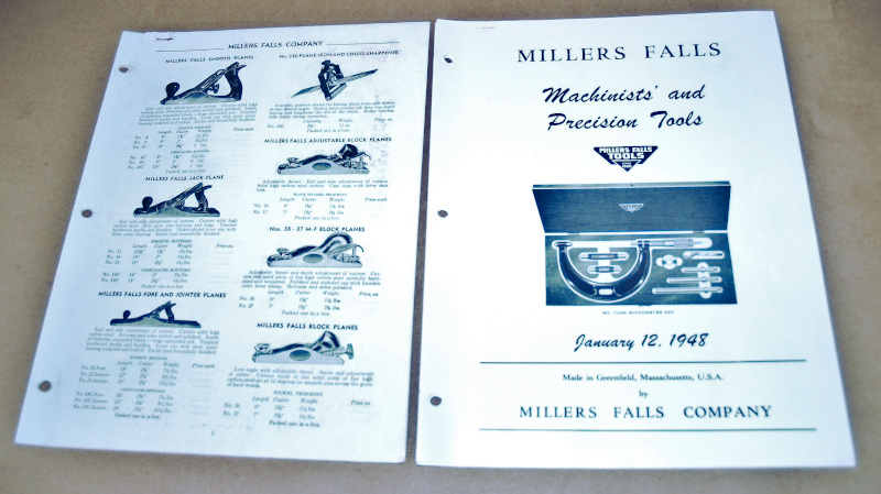 | 16936 | Millers Falls Company | Millers Falls Tools Trade Catalog(s) | Millers Falls | Good. One rusty staple. | 8.5 x 11 inches, 3 hole punched, page one starts with planes and finishes with a no. 200 saw punch. Millers Falls Machinists and Precision Tools , January 12, 1948, and is 10 pages long. | Millers Falls, Trade Catalog | $20 |