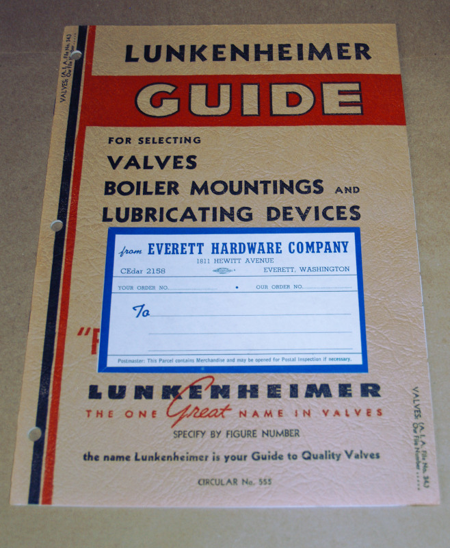 | 16968 | Lunkenheimer | Lunkenheimer Guide For Selecting Valves BoilerMountings and Lubricating Devices | Lunkenheimer | Good. Hardware Company stamp on the front cover. | 7.5 x 10.5 inches, multicolored tabbed pages, Lunkenheimer Guide For Selecting Valves BoilerMountings and Lubricating Devices. Circular No. 555. | Trade Catalog, Lunkenheimer | $20 |