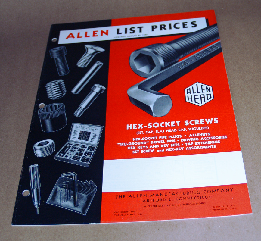 | 16977 | The Allen Manufacturing Company | Allen List Prices | The Allen Manufacturing Company | Very good. | 8.5 x 11 inches, a trade catalog for Allen Hex-Socket Screws. There are tables and illustrations. | Trade Catalog, The Allen Manufacturing Company | $20 |