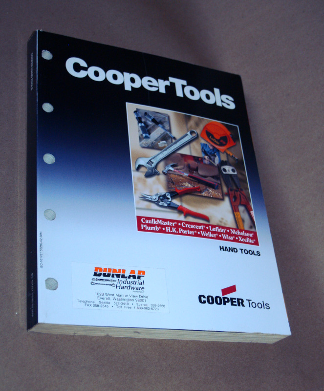 | 16987 | Copper Tools | Copper Tools Hand Tools | Cooper Tools | Very good. | 8.5 x 11 inches, trade catalog for Cooper Tools. There's a Dunlap Industrial Hardware sticker on the front cover. | Trade Catalog, Cooper Tools | $25 |