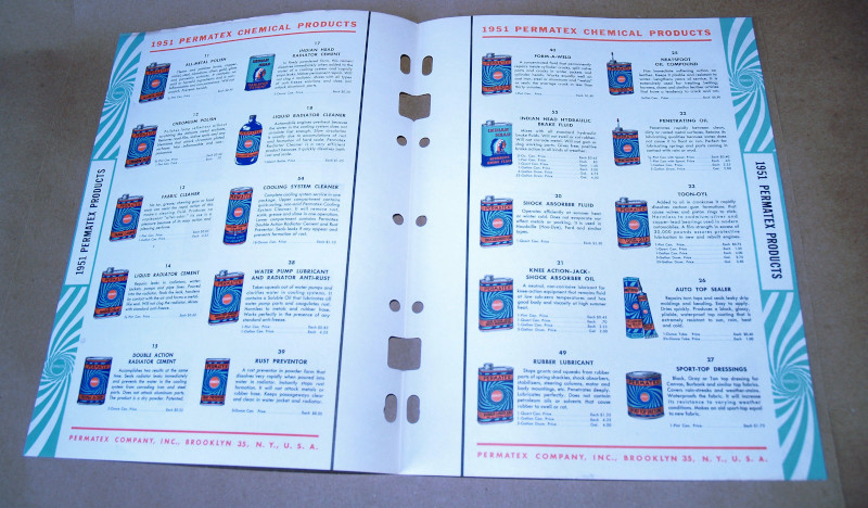 | 17005 | Permatex Company | 1951 Permatex Chemical Products | Permatex Company | Very good | 8.5 x 11 inch catalog inserts for Permatex chemical products. | Trade Catalog, Permatex Company, automotive, ephemera | $20 |