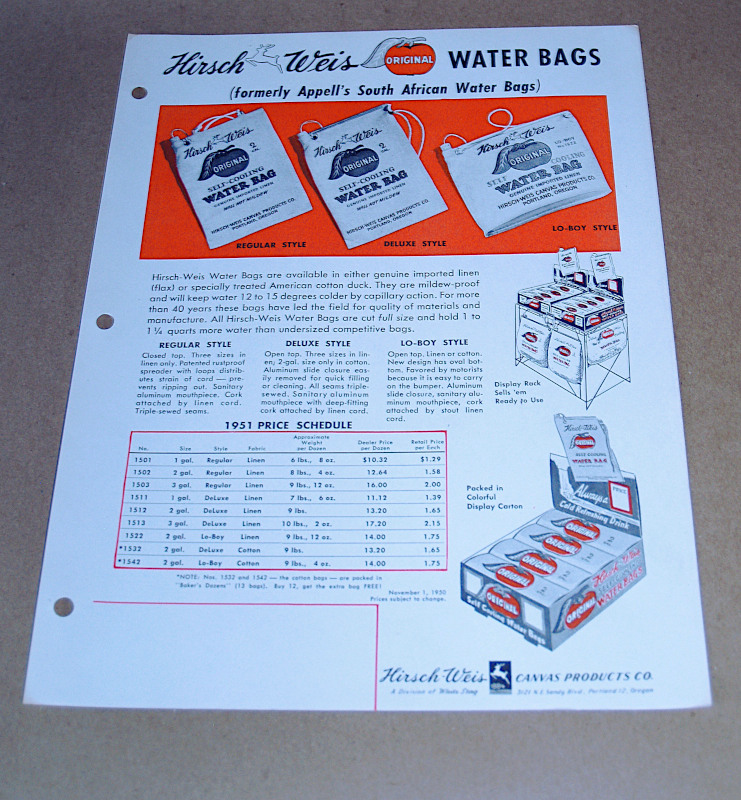 | 17006 | Hirsch-Weis Canvas Products Company | Hirsch Weis Original Water Bags | Hirsch Weis Canvas Products Company | Very good | A trade catalog page for the Hirsch Weis Canvas Products Co. (formerly Appell's South Aftican Water Bags) 8.5 x 11 inches | Trade Catalog, Hirsch Weis Canvas Products | $20 |