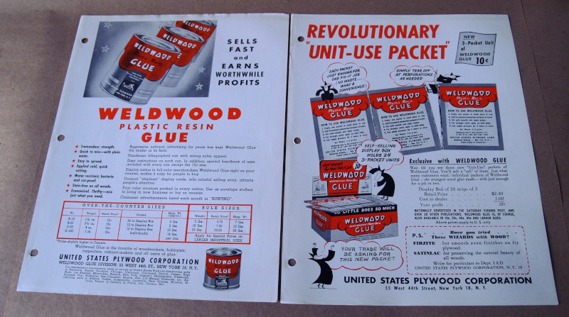 | 17019 | Staff | Weldwood Glue | United States Plywood Corporation | Very good. | 2 8.5 x 11 inch trade catalog pages for Weldwood Glue | United States Plywood Corporation, Trade Catalog, Weldwood Glue | $20 |