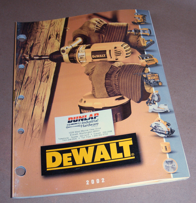 | 17137 | Dewalt Staff | DeWalt 2002 Catalog | DeWalt | Good. At least one page has inked in prices. Light shelf wear. | Trade Catalog. 8.5 x 11 inches. | DeWalt, Trade Catalog | $20 |