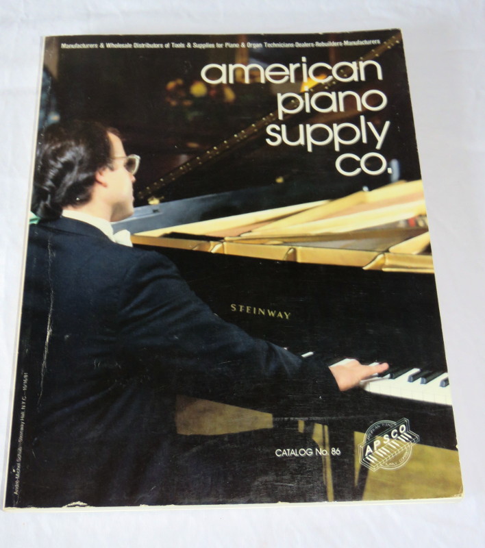 | 17302 | Staff | American Piano Supply Co. Catalog No. 86 | American Piano Supply Co. | Good. Light shelf wear. | 8.5 x 11 inches with many b&w illustrations, an index and a separate price catalog. | Trade catalog, piano | $25 |