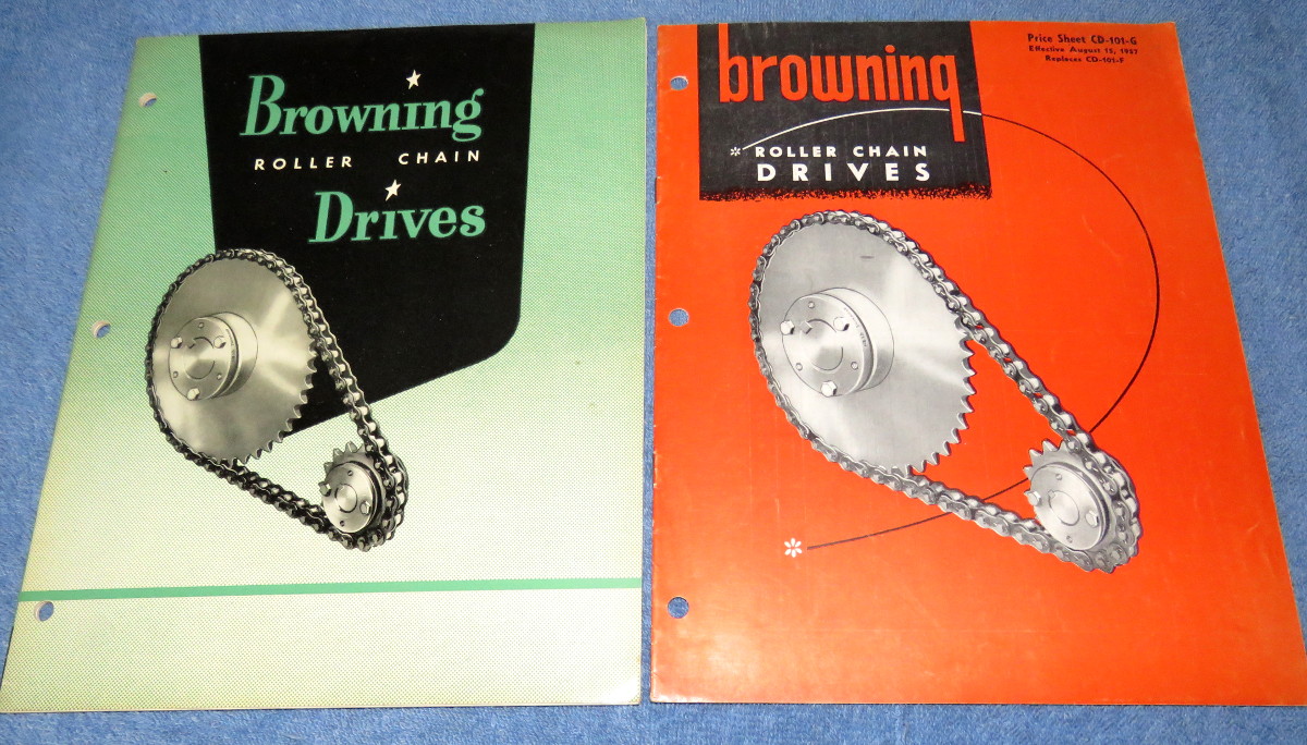 | 17524 | Browning Manufacturing Company | Browning Roller Chain Drives Catalog CD-102-B | Browning Manufacturing Company | Very good. | Browning Roller Chain Drives. Many tables and some engineering data. Also included is Price Sheet CD-101-G from 1957 | Trade Catalog, Roller Chain, Browning Manufacturing Company | $20 |