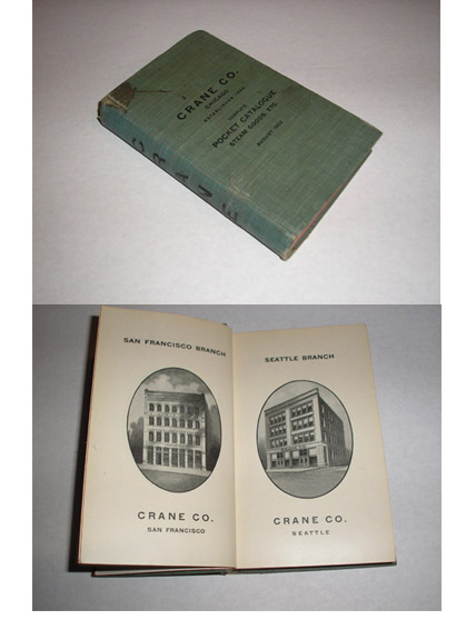 | 8909 | Crane Co. | Crane Co. Complete Pocket Catalogue Steam Goods. Etc. | Crane Co. August 1902, 4x6.5 inches, with 464 pages and many illustrations. | Fair to good. Shelfwear and soiling on the covers and spine. One inch dark stain on the front cover. (green cloth) Short crack on the back hinge. Contents very good. No dust wrapper. | August 1902 hardback, 4 x 6.5 inches, with 464 pages and many illustrations. Trade catalog. | Crane Co., trade catalog, Steam | $50 |