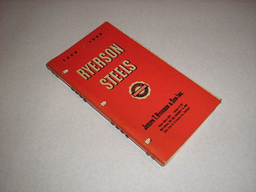 | 8921 | Ryerson, Joseph T. | Ryerson Steels 1949 + 1950 | Ryerson Steels | Good to very good with light shelf wear. | 1949 spiral bound paperback , 4.5x8.5 inches with 240 pages. Thumb tab, b&w photos and illustrations. Trade catalog. | Ryerson Steels, steel, trade catalog | $20 |