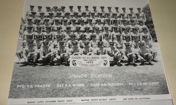 | 12312 | Anon. | Platoon 143 U.S. Marine Corps San Diego 1953 Photograph | U.S.M.C. | Good. Curly. | 8 x 10 inch official photo of Platoon 143 U. S. Marine Corps, San Diego, 1953. They were the Honor Platoon. PFC. V.G. Frazier, SGT. R.A. Moore, Corp. K.R. Guiducci, PFC E.D. Mc Curdy are mentioned. | USMC, United States Marine Corps, PFC. V.G. Frazier, SGT. R.A. Moore, Corp. K.R. Guiducci, PFC E.D. Mc Curdy, photograph, ephemera | $20 |