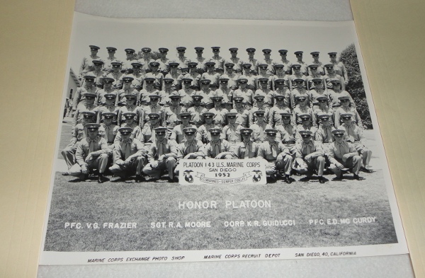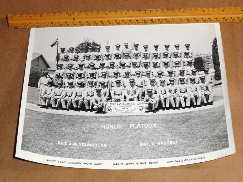 | 16012 | Marine Corps Exchange Photo Shop | Platoon 269 U.S. Marine Corps San Diego 1954, Photo | USMC | Good. One creased corner. The photo has a curl. | 8 x 10 Inch b&w photo of USMC Platoon 269, San Diego, 1954. Honor Platoon. Sgt. J.M. Youngberg & Sbt. C. Hassell are referenced. | USMC, San Diego, California | $20 |