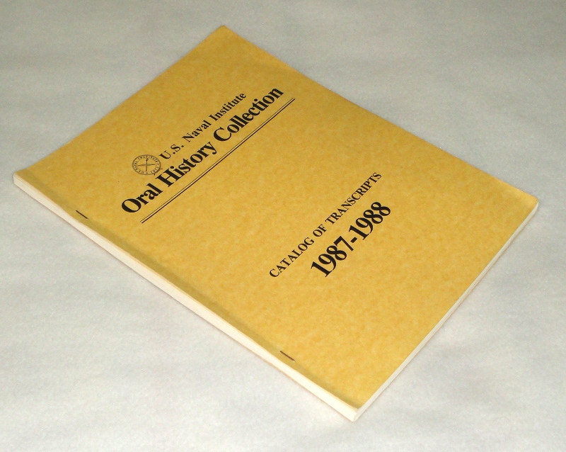| 13588 | U.S. Naval Institute | U.S. Naval Institute Oral History Collection Catalog Of Transcripts 1987-1988 | U.S. Naval Institute | Very good. Faint shelf wear | 8.5 x 11 inches, a list of interviews, interviewees and a short synopsis of the interview and subject matter. | United States Navy, United States Marine Corps, USN, USMC | $25 |