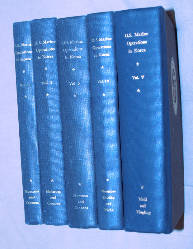 | 16328 | Montross, Lynn & others | U. S. Marine Operations In Korea 1950-1953 | Historical Branch, G-3 Headquarters U. S. Marine Corps | Good. Owner's names inside. Light soiling and wear. | The U. S. Marine Corps in the Korean war. There are many maps, b&w photos, appendices, bibliography and an index. Vol. 1, The Pusan Perimeter, Vol. 2, The Inchon-Seoul Operation, Vol. 3, Thke Chosin Reservoir Campaign, Vol. 4, The East-Central Front, Vol. 5, Operations in West Korea. | Korea, Korean War, USMC | $200 |