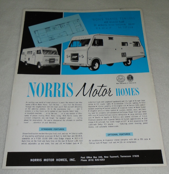 | 12368 | Norris Motor Homes | Norris Motor Homes | Norris Motor Homes | Very good. | A one-sided 8.5 x 11 brochure for Norris Motor Homes made in New Tazewell, Tennessee. | Norris Motor Homes, recreation vehicle, ephemera, automotive | $20 |