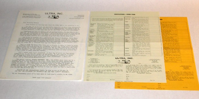| 12694 | Knipe, Larry, Sales Manager | Ultra Van Recreation Vehicle Literature | Ultra, Inc. | Very good. | 8.5 x 11 inches, an advertising letter from Ultra, Inc., about their Ultra Van, mostly fluff. There are also two copies of a specifications - order form, one to send and one to keep. | Ultra Van, Recreation Vehicle, ephemera | $20 |