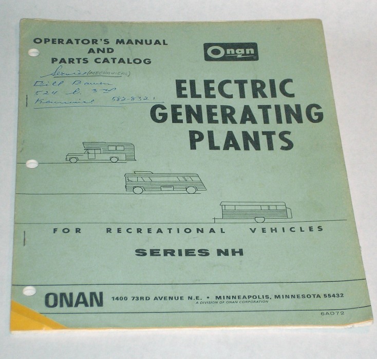 | 12822 | Onan | Operator's Manual And Parts Catalog for Recreational Vehicles Series NH | Onan | Good. Owner's name and 4 lines of ink on the front cover. The bottom left corner of the front cover is clipped. | 8.5 x 11 inches, a stapled shop and parts manual for an Onan Series NH genset. | Recreation Vehicle, Onan Genset, Series NH | $20 |