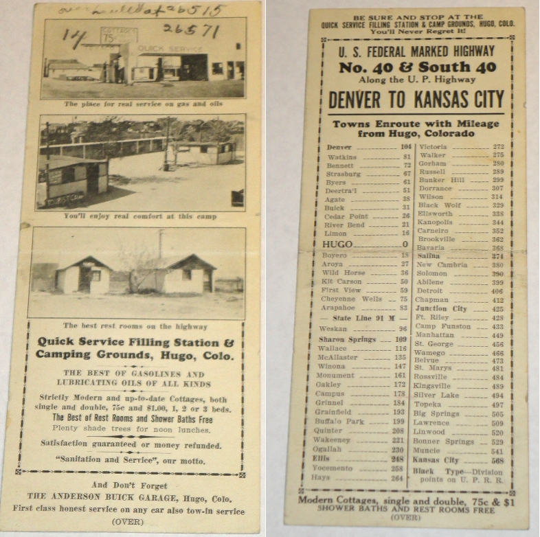 | 13545 | Anon | Quick Service Filling Station & Camping Grounds, Hugo, Colorado | Quick Service Filling Station & Camping Grounds, Hugo, Colorado | Good. Writing, soiling and a sharp horizontal crease. | 3.5 x 8.5 by 8.5 inch 1920s brochure for a gas station and camping ground in Hugo, Colorado with three b&w photos. There's a milage list on he back. | Ephemera, Hugo,Colorado, recreation vehicle, | $20 |