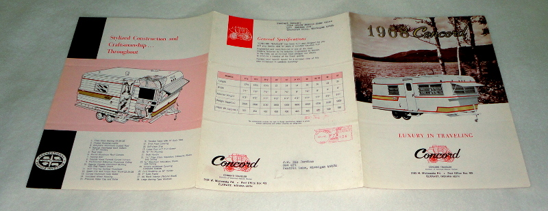 | 14194 | Concord Motor Homes | 1968 Concord Luxury In Traveling | Concord Motor Homes | Good. Two horizontal folding creases. | 25.5 x 11 inches, 2 folds, both sides, 1968 Concord Trailer models with floorplans and features. | Recreation Vehicle, ephemera, Concord Trailers | $20 |