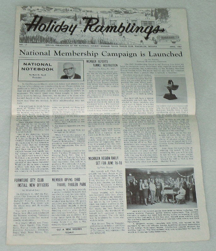 | 14196 | The National Holiday Rambler Travel Trailer Club | Holiday Ramblings No. 17 April, 1967 | The National Holiday Rambler Travel Trailer Club | Very good. | 11 x 15 inches with b&w photos, the Holiday Rambler Trailer newsletter. There are several articles. | Recreation Vehicle, ephemera, Holiday Rambler | $20 |
