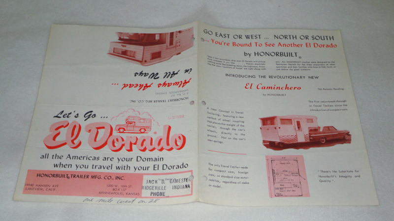 | 14198 | Homebuilt Trailer Mfg. Co., Inc. | Always Ahead in All Ways | Homebuilt Trailer Mfg. Co., Inc. | Good. Punched for a 3-ring binder affecting the text in two places. Light wear and soiling. Handwriting and a dealer stamp on one section. Some creasing. | 8.5 x 11 inch multiple fold one color brochure on Honorbuilt Trailers and campers. The Eldorado truck camper is featured. | Recreation Vehicle, ephemera, Honorbuilt Trailer | $20 |