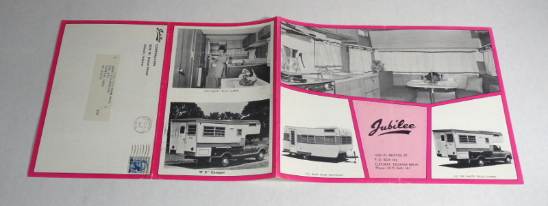 | 14827 | Jubilee Corporation | Jubilee Sales Brochure for RVs' | Jubilee Corporation | Good. Light shelf wear. | 11 x 8.5 inches brochure from the Jubilee Corporation in Elkhart, Indiana for their trailers and truck campers. B&w photos. Floor plans | Jubilee Corporation, Recreation Vehicles | $20 |