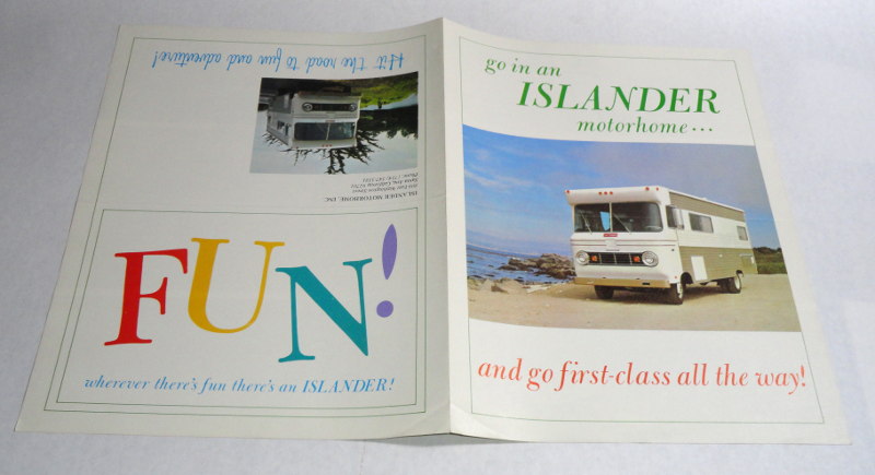 | 15458 | Islander Motorhome, INC. | Go In An Islander Motorhome... | Islander Motorhome, INC. | Good. Some shelfwear and creasing. | 8.5 x 11 inches with color pictures and floor plans. Dodge chassis. | Recreation Vehicle, motorhome, automotive, Dodge, ephemera | $20 |