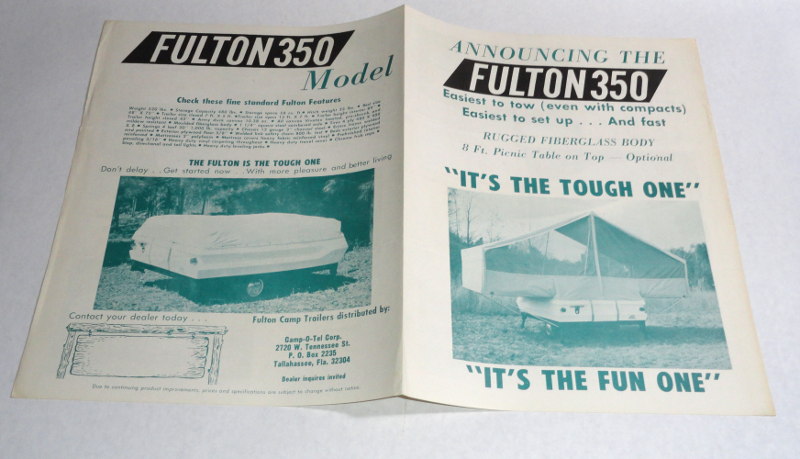 | 15459 | Camp-O-Tel Corp. | Announcing The Fulton 350 | Camp-O-Tel Corp | Good. Light shelf wear, soiling and creasing. | 8.5 x 11, the Fulton 350 tent camper. Manufactured in Tallahassee, Fla. There are green-toned photos showing how to set the camper up. | Recreation Vehicle, Tent Camper, Fulton Camp Trailers, ephemera | $20 |