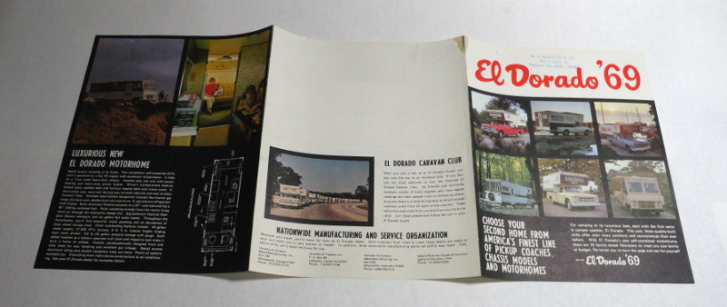 | 15514 | Staff | El Dorado '69 | El Dorado | Good. There's a 3 line rubber sales stamp on the front cover. There is a small brown moisture stain affecting the top corners of 4 pages. | 8.5 x 11 inches fold-out brochure for El Dorado truck campers and their motorhome with color pictures and floor plans. | El Dorado, recreation vehicle, ephemera | $20 |