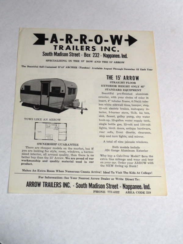 | 15515 | Staff | Arrow Trailers Inc. brochure | Arrow Trailers, Inc. | Very good. | 8.5 x 11 inches, one page on both sides featuring the 15' Arrow and the 13' Bow. B&w photos of the trailers and floor plan drawings. | Arrow Trailers Inc., recreation vehicles, ephemera | $20 |