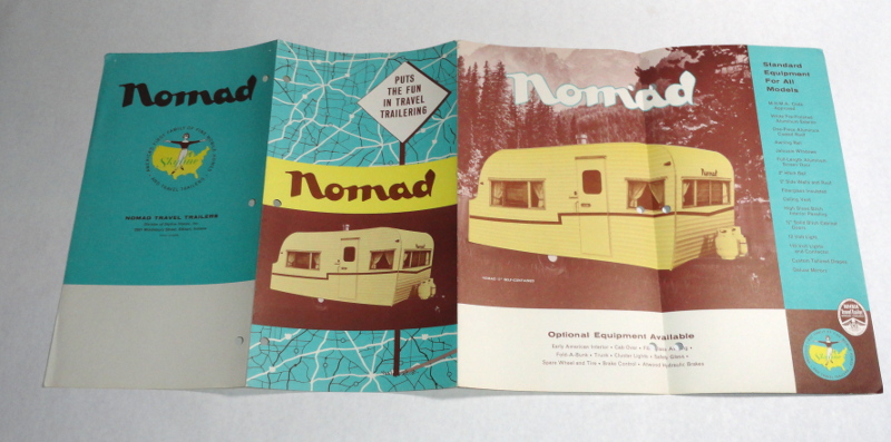 | 15517 | Staff | Nomad Travel Trailers | Nomad Travel Trailers Division of Skyline Homes, Inc. | Good. Punched for a 3 ring binder. | 18 x 11 inch 3 fold brochure for Nomad Travel trailers from the late? 1960s. Multiple trailers are pictured along with 8 floor plans. | Nomad Travel Trailers, recreation vehicle, ephemera | $20 |