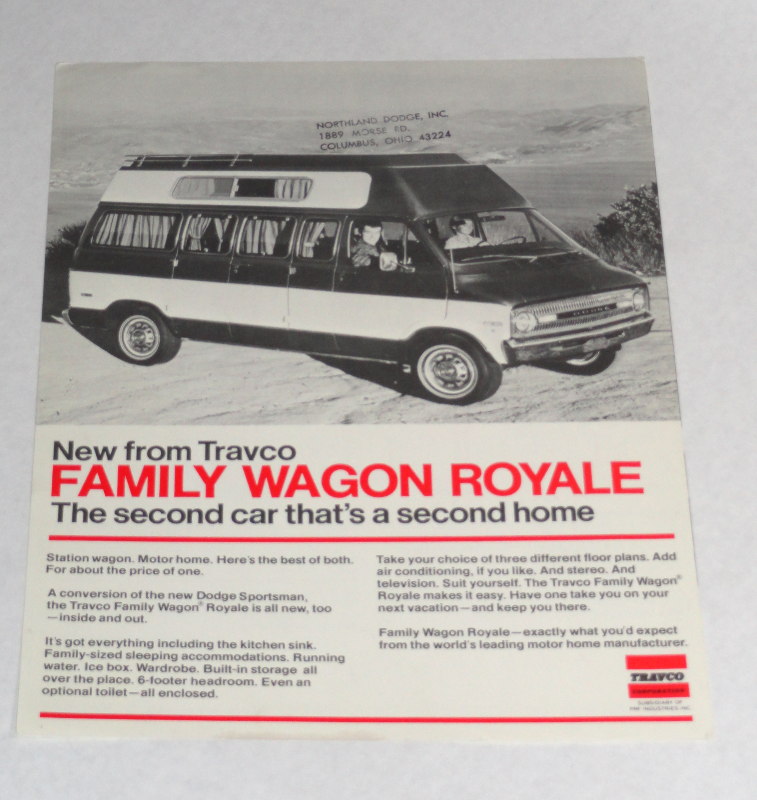 | 15519 | Travco | New from Travco Family Wagon Royale | Travco | Good. There's a dealer 3 line stamp on the front. | 8.5 x 11 inches, a 1 page both sides ad for a Dodge Sportsman conversion by Travco. 3 floor plans are shown on the flip side. | Recreation Vehicle, Travco, Dodge Sportsman, ephemera. | $20 |