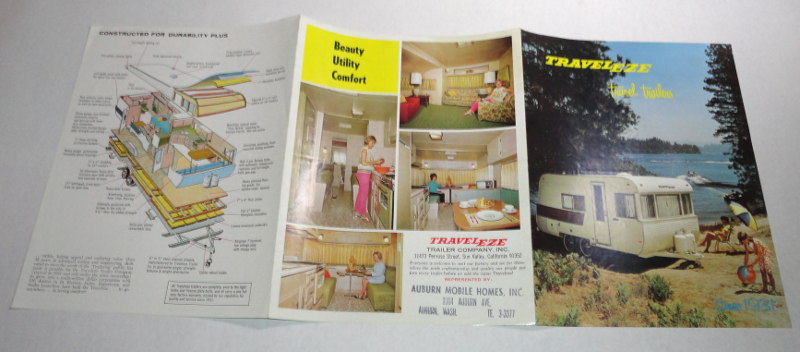 | 15523 | Anon. | Traveleze Travel Trailers Brochure | Traveleze Trailer Company | Good. There's a trailer company 3 line rubber stamp. | 8.5 x 11 inches, a three fold brochure for Traveleze trailers. Specifications and floor plans for several models. | Traveleze Travel Trailers, Recreation Vehicle, ephemera | $20 |