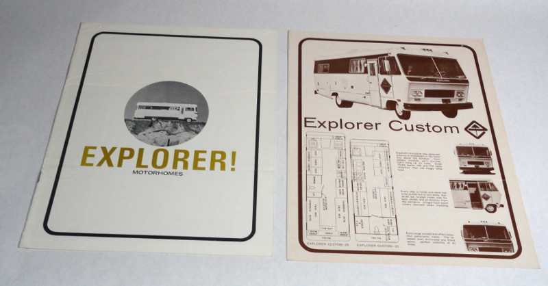 | 15556 | Explorer Motor Home Corporation | Explorer! Motor Homes | Explorer Motor Home Corporation | Good. Fold marks. Light shelf wear. One thumb tack mark in a corner. | 8.5 x 11 inch literature for Explorer Motor Homes circa 1970. Built on a Dodge chassis, there are 21', 23' and 25' models. There's one 6 page brochure and a one page on both sides brochure for the Custom Model. | Recreation vehicle, Explorer Motor Home, ephemera | $20 |