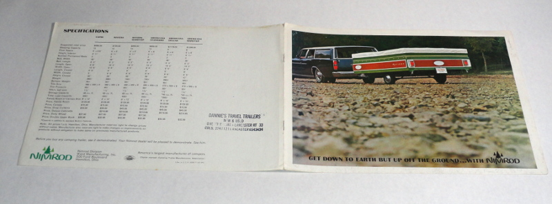 | 15557 | Nimrod Staff | Get Down To Earth But Up Off The Ground...With Nimrod | Nimrod Division Ward Manufacturing, Inc. | Good. Some light shelf wear. A trailer sales rubber stamp on the back. | 11.5 x 8.25 inch color brouchure for circa 1965 Nimrod Tent Trailers | Recreation Vehicle, Nimrod, tent camper, ephemera | $20 |