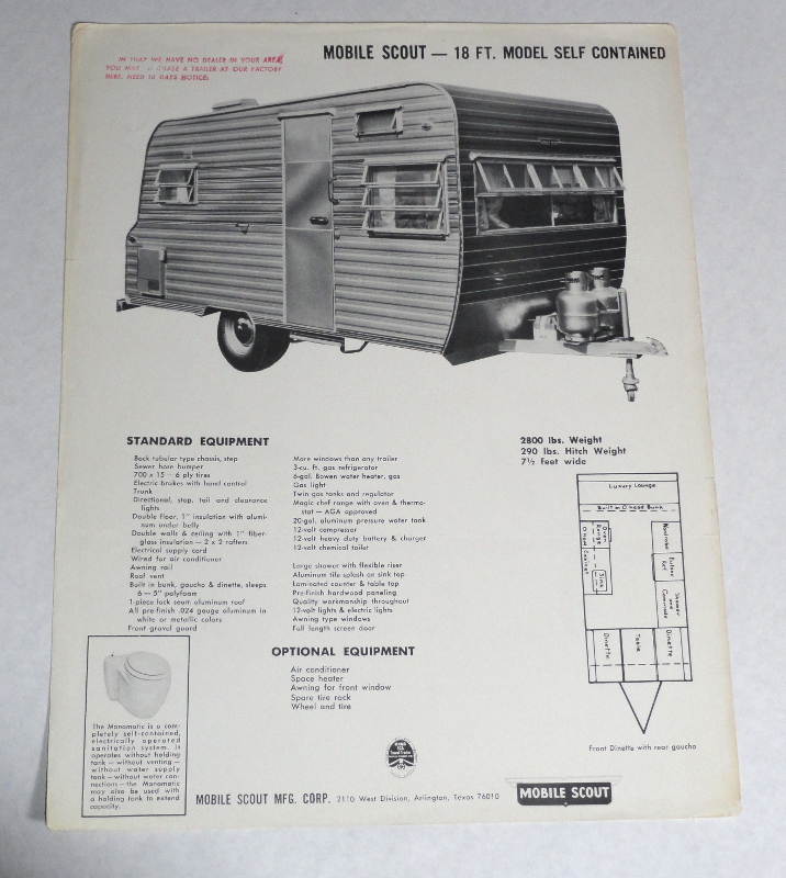 | 15561 | Mobile Scout | Mobile Scout 18 Ft. Model Self Contained | Mobile Scout | Good. Three fold marks to fit a business envelope | 8.5 x 11 inch one page brochure for the 18 Ft. Mobile Scout Travel Trailer from the late 1960s to the early 1970s. One picture, specifications and a floor plan. | Recreation Vehicle, Mobile Scout | $20 |