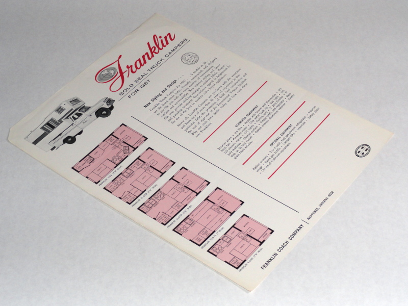 | 15578 | Franklin Coach Company | Franklin Gold Seal Truck Campers For 1967 | Franklin Coach Company | Good. One corner is clipped | 8x10.5 one page brochure for Franklin Truck Campers of 1967. There is one picture, 5 floor plans and a list of standard and optional equipment. | Franklin Coach Company, recreation vehicle | $20 |