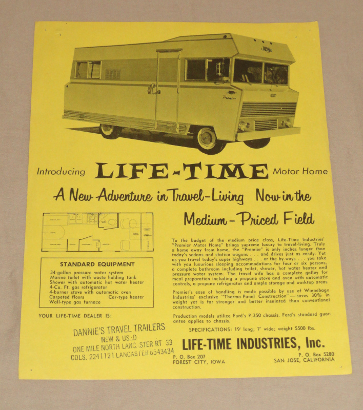 | 15833 | Life-Time Industries (Winnebago) | Introducing Life-Time Motor Home | Life-Time Industries (Winnebago) | Very good. Dealer's rubber stamp on the front. | A 8.5 x 11 inch sheet for Life-Time Motor Home, a precursor to Winnebago Motor Homes. This very early model was built on the Ford P-350 chassis. | Recreation Vehicle, Life-Time, Winnebago | $20 |