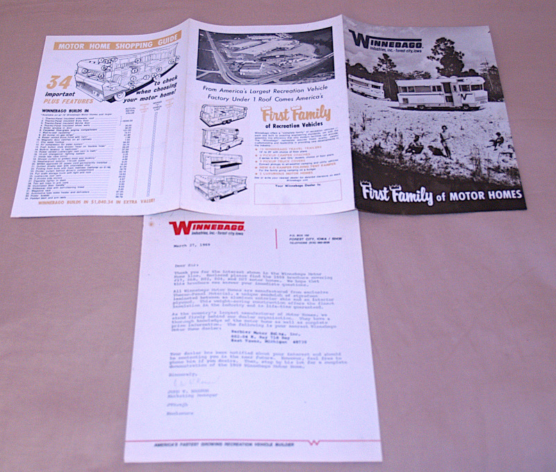| 16662 | Winnebago Industries | Winnebago Industries First Family of Motor Homes | Winnebago Industries | Very good. | Two fold, 21 x 10 inch early Winnebago Motor Home literature. B&w photos and illustrations. Includes separate cover letter. | Winnebago Motor Home, recreation vehicle, RV, ephemera | $25 |
