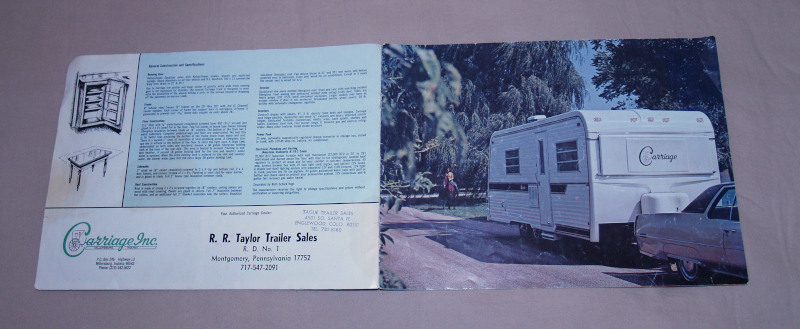 | 16843 | Carriage Inc. | Carriage Trailer Literature | Carriage | Good. Shelf wear and creasing. Trailer Sales Co. rubbern stamp on back. | 11.75 x 8.75 with many color pictures. | Recreation vehicles, Vintage RV, Carriage | $30 |