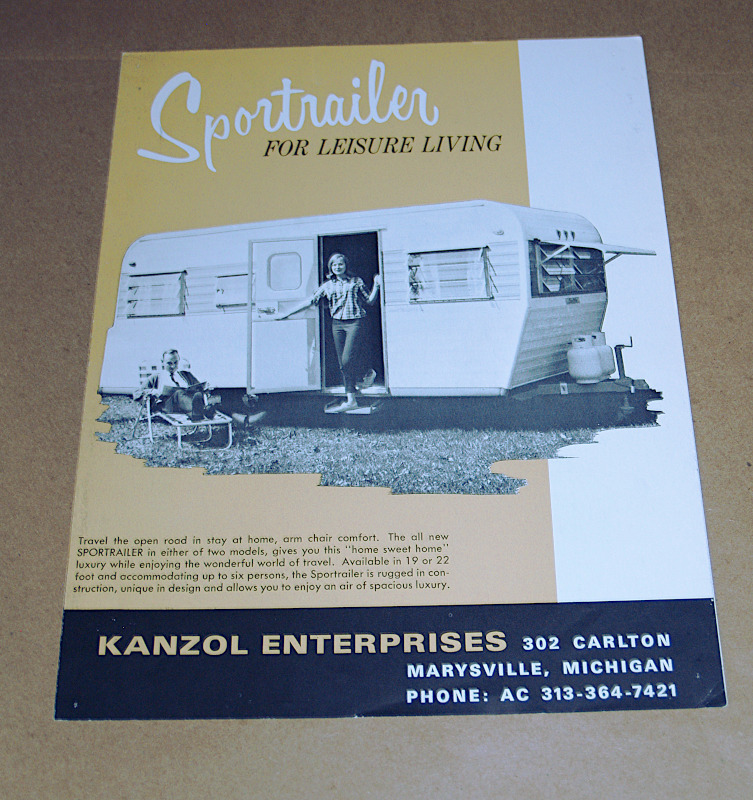 | 16967 | Kanzol Enterprises | Sportrailer For Leisure Living | Kanzol Enterprises | Good. Light shelf wear. Tiny tack holes in 4 corners. | 8.5 x 11 inches, 4 page 2 color brochure for 2 Sportrailer models manufactured in Marysville, Michigan | Recreation Vehicle, Vintage RV, Kanzol enterprises | $25 |