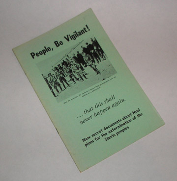 | 10503 | Canadian Slav Committee | People, Be Vigilant! | Canadian Slav Committee | Good. Light shelf wear, soiling and creasing on the covers. One short ink-mark on the front cover. There is a one inch rip right on the bottom of the spine. Pages are yellowing. | Circa later 1940's paperback brochure with 15 pages, one cover picture and 2 b&w illustrations. "New secret documents about Nazi plans for the exterminatioin of the Slavic Peoples." | ww2, Slavic, Nazi, Canada | $35 |