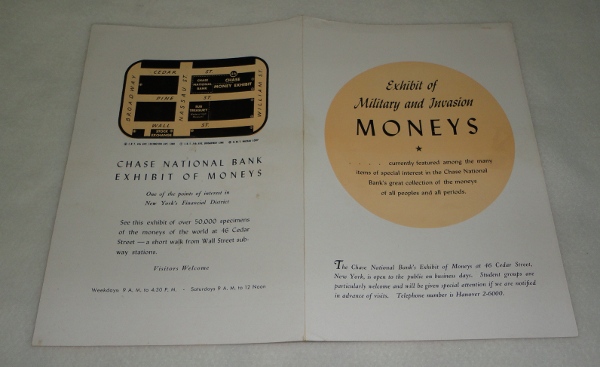 | 12330 | Chase National Bank | Exhibit of Nilitary and Invasion Moneys | Chase National Bank | Very good. | A single fold 9 x 12 inch sheet printed on both sides. The inside is a picture of WW2 military and invasion money. | WW2, paper money, ephemera | $20 |