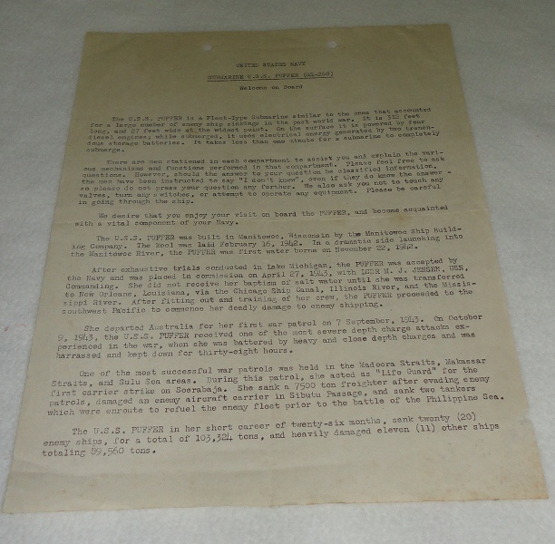 | 12334 | U.S.S. Puffer (SS-268) staff | United States Navy U.S.S. Puffer (SS-268) Welcome On Board | United States Navy | Good. One vertical and one horizontal crease with two punch marks on top. | 8.5 x 11 handout for visitors to the Submarine U.S.S. Puffer (SS-268). The sub's history is mentioned, WW2 patrols, what to ask the tour leaders and what not to ask. | Ephemera, WW2, Submarine, USN, United States Navy, U.S.S. Puffer (SS-268) | $20 |