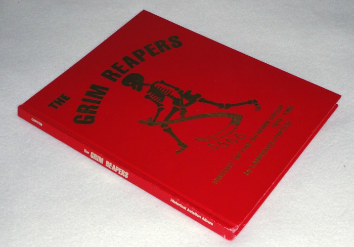 | 13259 | Cortesi, Lawrence | The Grim Reapers History Of The 3rd Bomb Group 1918 - 1965 | Historical Aviation Album | Good. Light shelf wear on the covers and spine. Owner's small stamp inside. Careful red ink lines on the maps and hyliter on a couple of pages. No dust wrapper. | 8.5 x 11 inches, a history of the 3rd Bomb Group. There are many b&w photos, mostly of WW2 in the far east. Lots of B-25s | United States Air Force, 3rd Bomb Group, WW2, B-25 Mitchell | $30 |