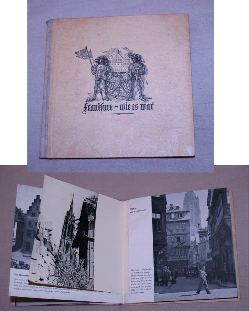 | 16817 | Unknown | Frankfurt - Wie Es War | German | Good. | 6 x 6 inches, pictures of Frankfurt, Germany before the war with actual pictures on photo paper after the war. Black and white. | WW2, Frankfurt, Germany | $50 |