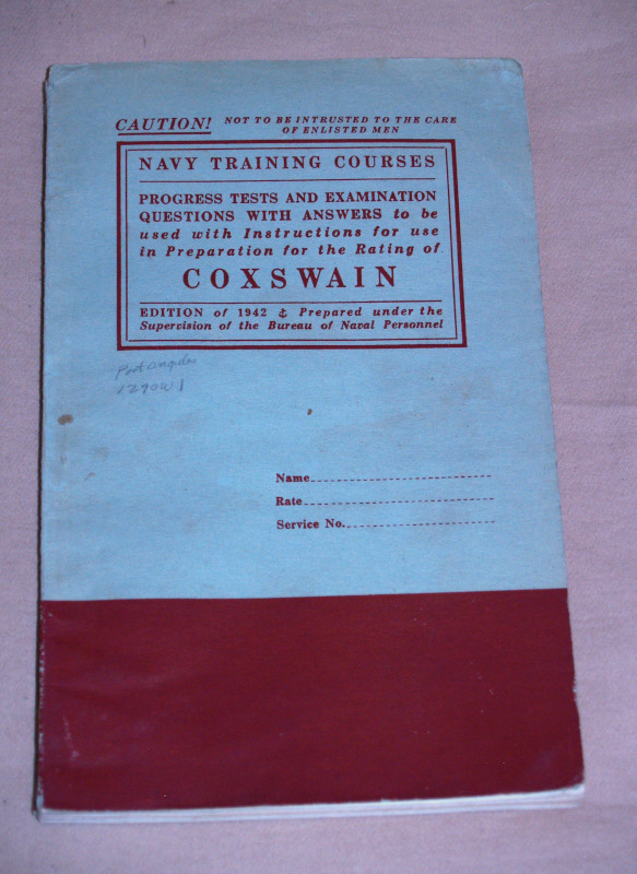 | 16838 | United States Navy Department | Coxwain | United States Navy | Good. Shelf wear and soiling, rusty staple. | 1942 USN training course for Coxwain. A warning on top of the book: "Caution! Not to be intrusted to the care of enlisted men." | USN, WW2, Coxwain | $25 |