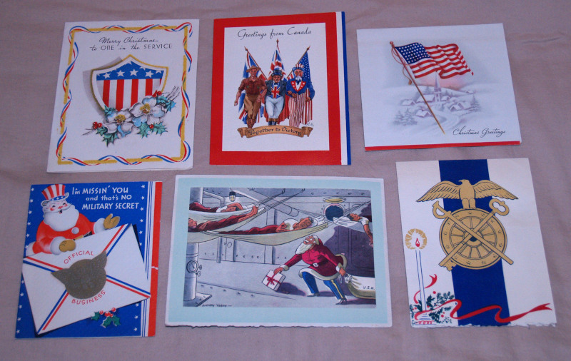 | 16879 | Greeting Card Authors | Six WW2 Christmas Cards To A Soldier | Multiple | Very good. All cards have written messages to "Bob" in ink. | Six WW2 Christmas cards to a soldier, including a USN themed greeting in color by New Yorker cartoonist, Barney Tobey. | WW2, Christmas, USN, Barney Tobey, ephemera | $25 |