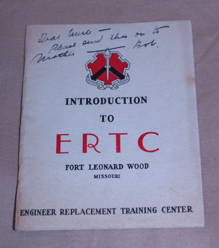| 16883 | Engineer Replacement Training Center | Introduction To ERTC Fort Leonard Wood Missouri | US Army | Good. Some soiling. Rusty Staples. Three lines of writing in ink on the front cover. | 4.5 x 6 inches, information about the WW2 Engineer Replacement Training Center in Fort Leonard Wood, Missouri. | WW2, Fort Leonard Wood | $25 |