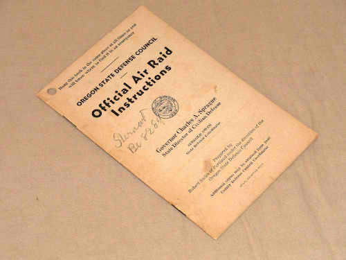 | 15843 | Smith, Robert | Oregon State Defense Council Official Air Raid Instructions | Oregon State | Good. Pencil on the front. Some soiling and wear. | 4 x 6 inch booklet with WW2 Air Raid Instructions. Pen & ink sketches | WW2, Aviation, Oregon | $25 |
